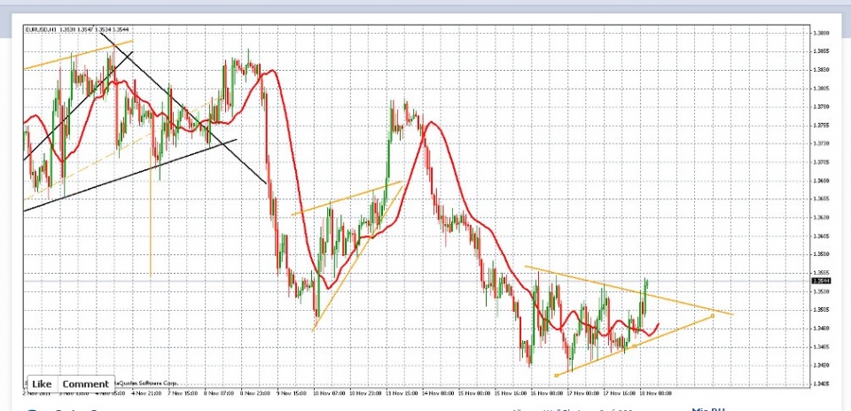 EURUSD, H1. Мне тут от брокера пришел рисунок любопытный. Вообщем со вторника по среду будет что-то жуткое такое агрессивно медведжье. Без всяких коррекций. Похоже что в понедельник надо зацепить цену как можно по выше )))