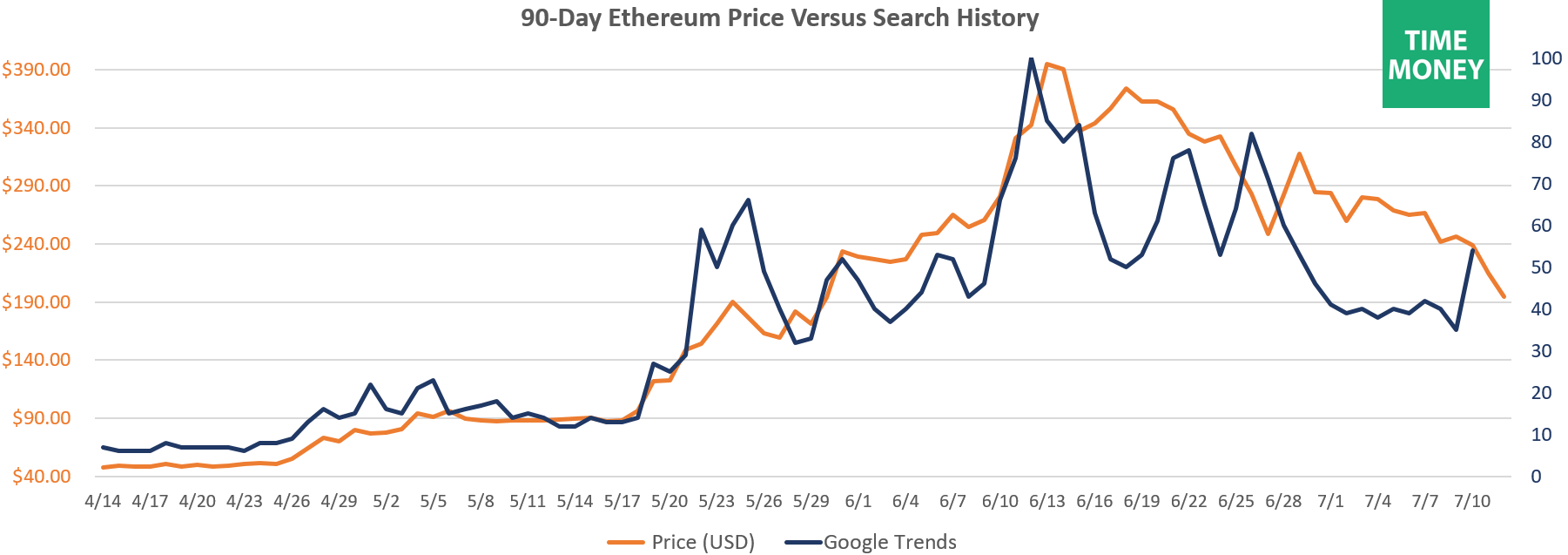 Поисковые запросы по Эфириуму падают вместе с ценой.